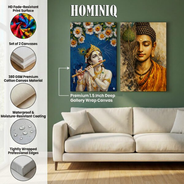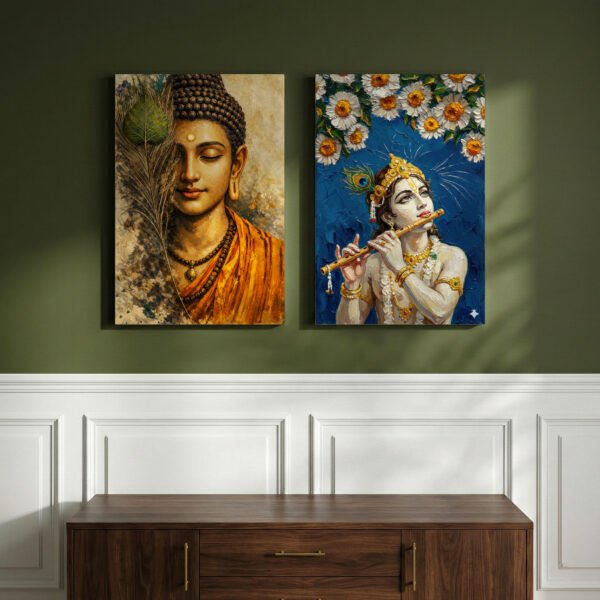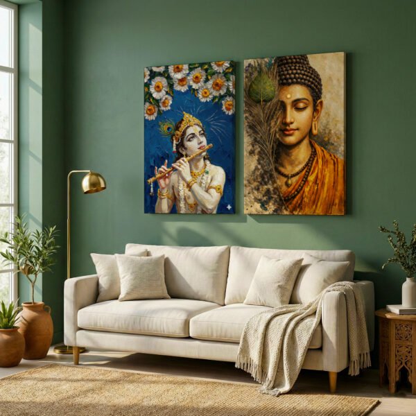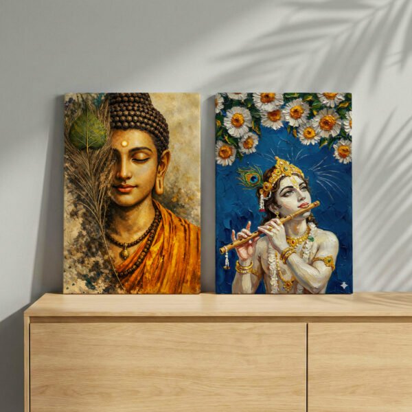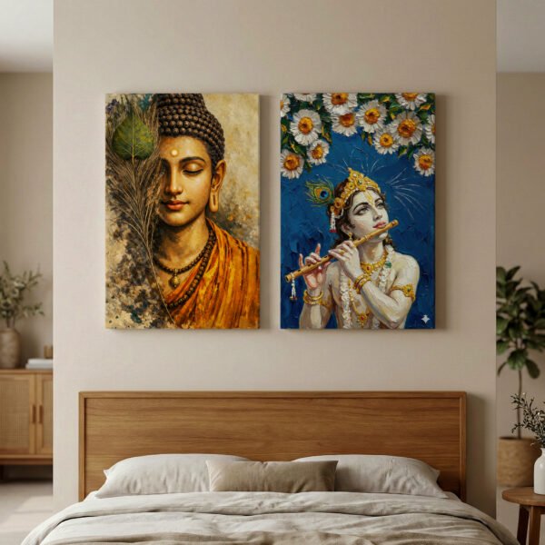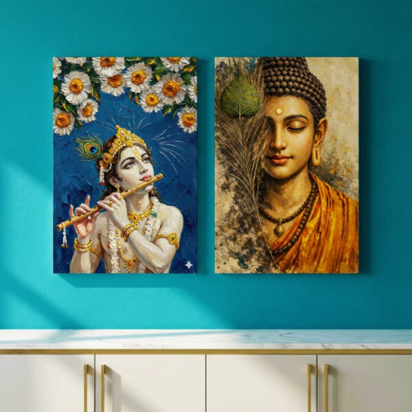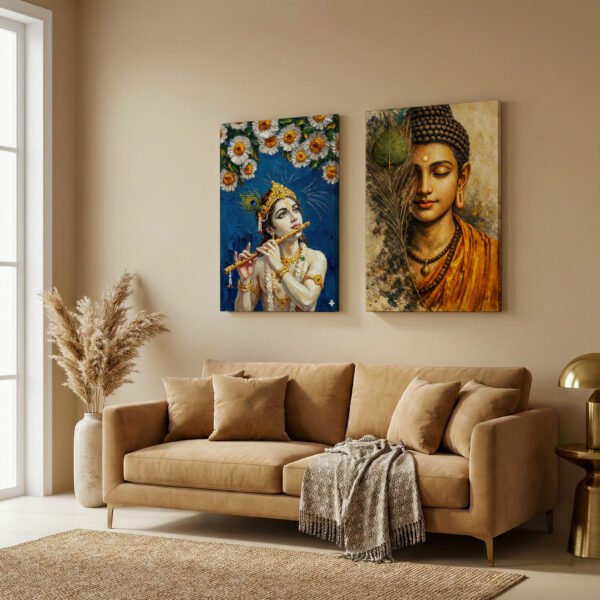 Bring calmness and divine energy into your space with this beautifully crafted Lord Buddha & Lord Krishna Spiritual Canvas Wall Art Set of 2. The artwork blends the peaceful meditative presence of Lord Buddha with the graceful, divine charm of Lord Krishna, creating a perfect balance of serenity and devotion.